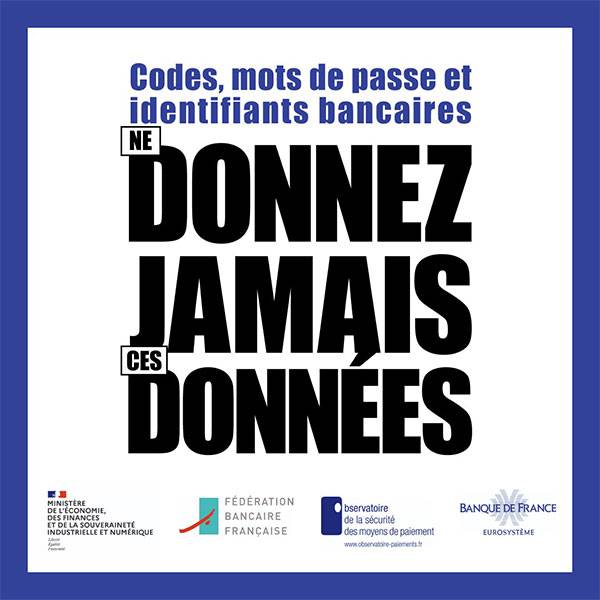 - Codes, mots de passe et identifiants bancaires : ne donnez jamais ces données !